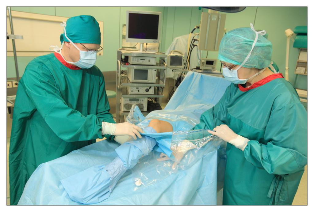Taking an example of a knee arthroscopy procedure we want to show how to properly protect a patient using the components of the set.
