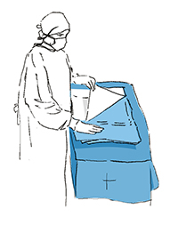 Having opened the set put it on the instrumental table. Use the outer drape to secure the table and remaining elements. Put the elements on the table paying attention to the pictograms on the drape (they show where to place each element).