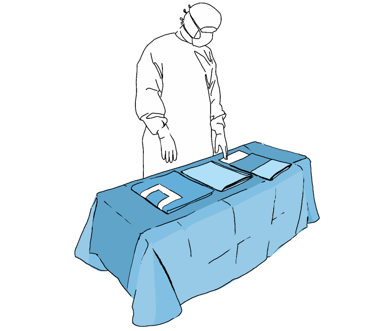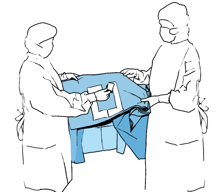 Before draping the patient (delimiting the surgical field), pay attention to the direction in which the drape is to be unfolded with the help of the pictograms.