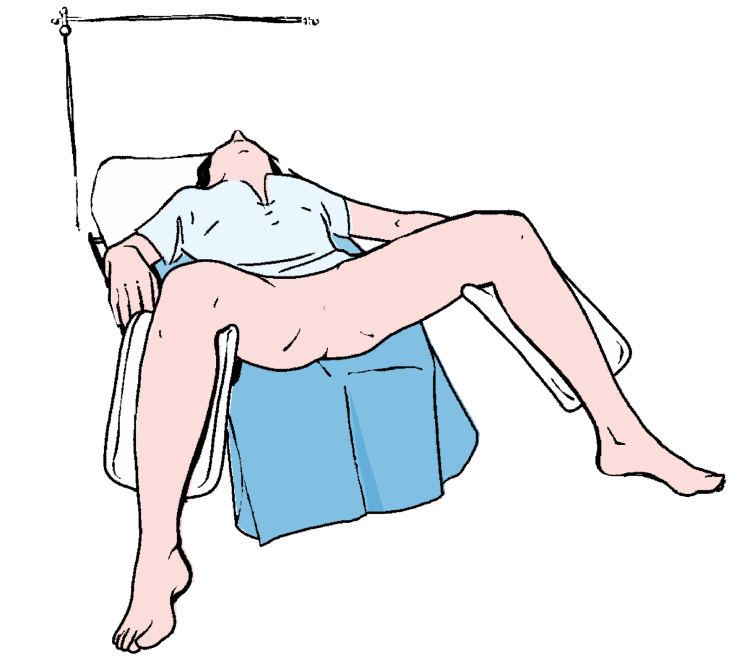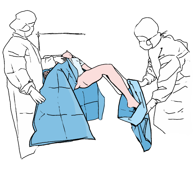 Pass the drape over the frame to create an anaesthesia screen. Unfold the lower part of the drape towards the lower end of the operating table, partially between the patient's legs.
