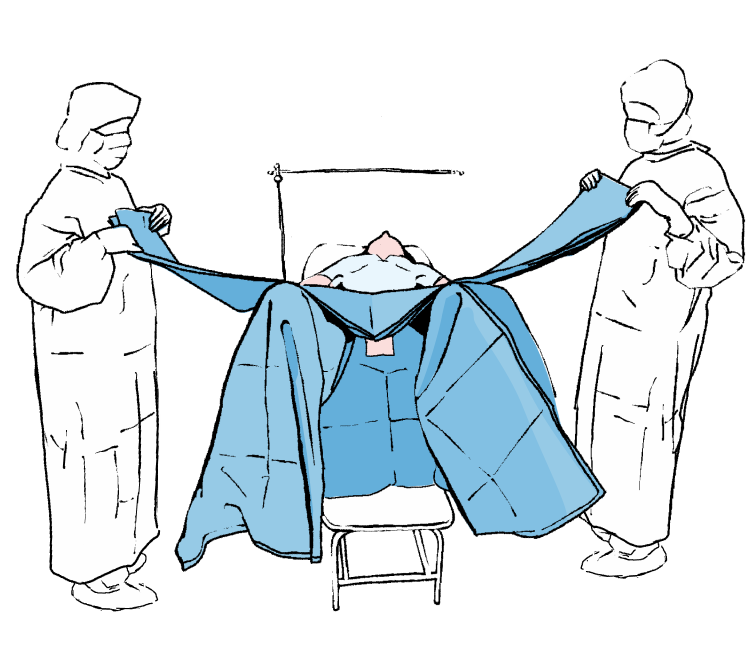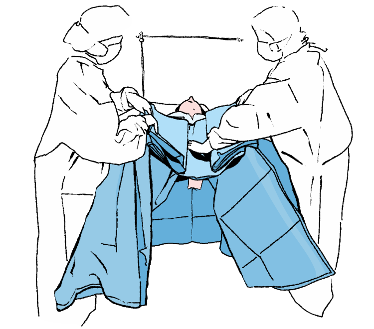 Unfold the sides of the drape so that they hang freely from the operating table, and then unfold the top of the drape toward the patient's head (towards the anaesthesia stand).