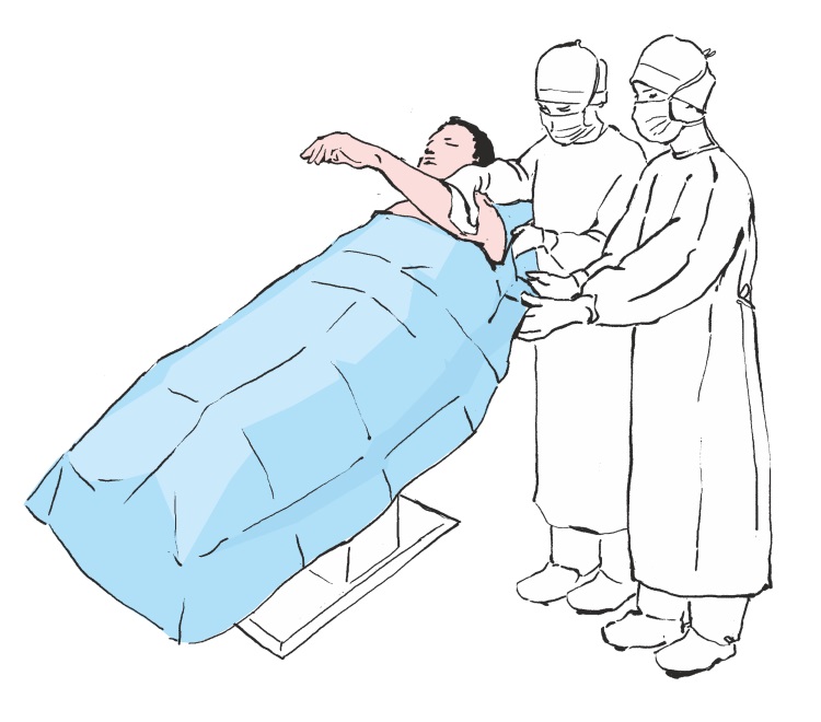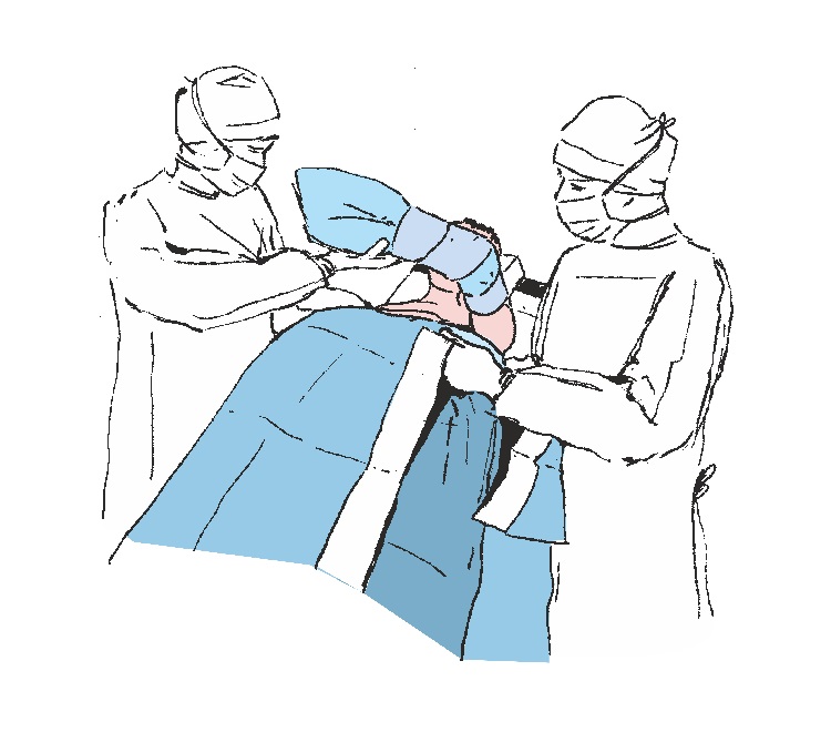 Remove the remaining release paper and stick the drape around the shoulder carefully towards the patient's head, thus delimiting the side boundaries of the operating field. Press down on the drape adhesion site to increase the adhesion of the adhesive tape to the patient's skin.