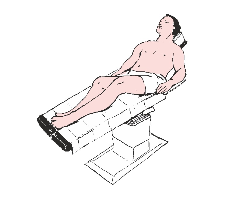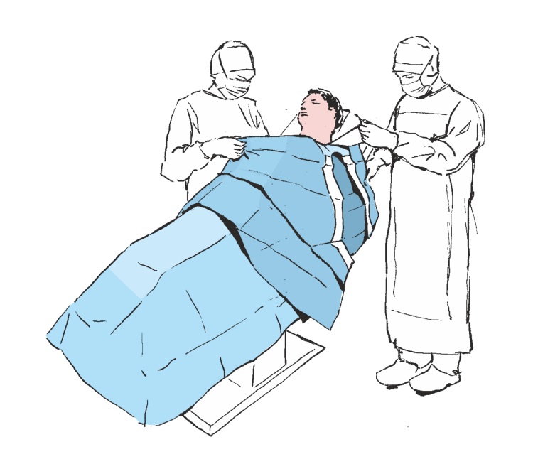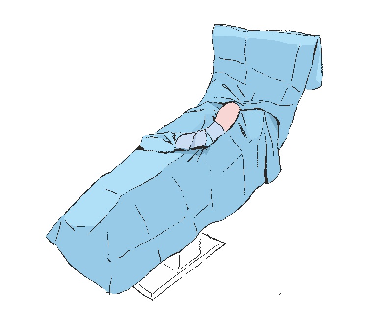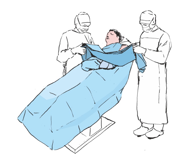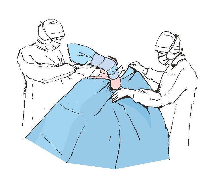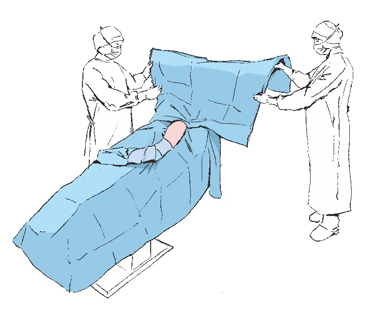 Unfold the lower part of the drape towards the lower edge of the operating table, thus protecting the patient's lower limbs.
