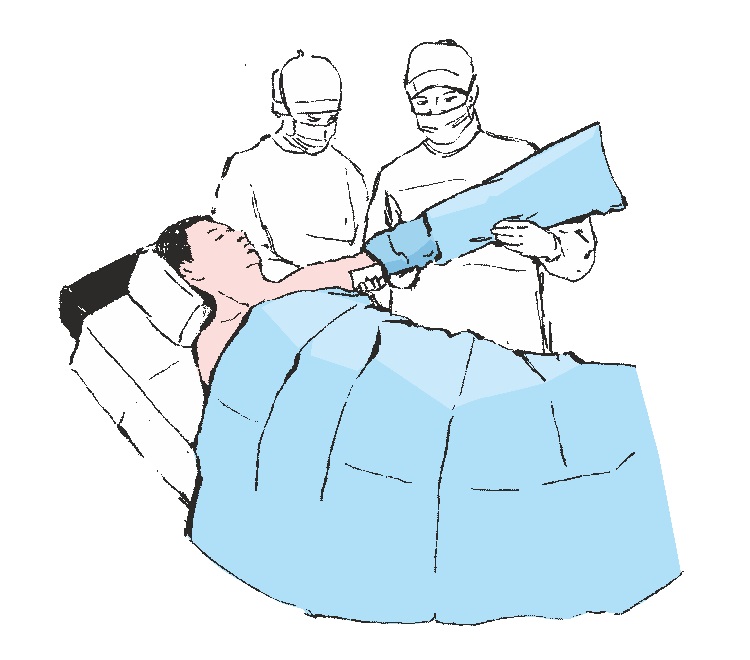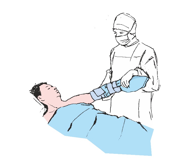 Slide the cover on the patient's upper limb at a height below the shoulder joint.